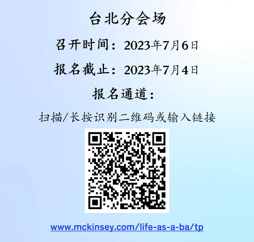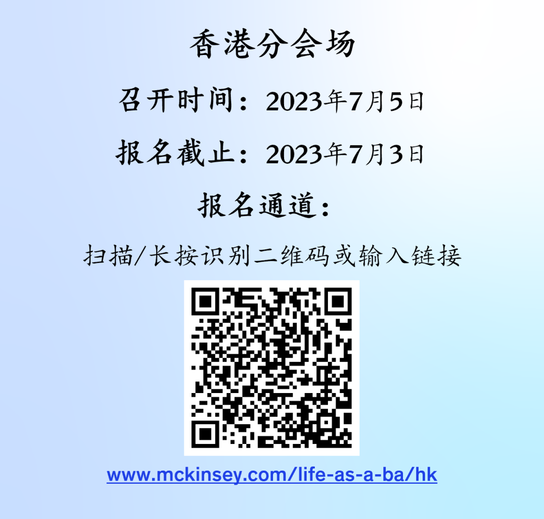 三场线上宣传会,带你走近麦肯锡,为大家阐述麦肯锡的发展历程、现状与愿景,分享企业文化、办公环境和工作体验,更重要的是,宣讲会将带来麦肯锡咨询顾问的个人分享,通过真实而鲜活的经历,让你获得有关职业成长与机会的第一手信息,相信这能够有效地助你做出准确的事业选择。此外,我们还会详细介绍招聘流程,传授面试技巧,贴士和建议,帮助各位同学顺利完成申请,助你斩获心仪offer。宣讲会向全员开放,香港、台北、北京/上海/深圳三场线上宣讲会,请根据你想要选择申请工作的办公室,尽快预约,以免超出截止日期。