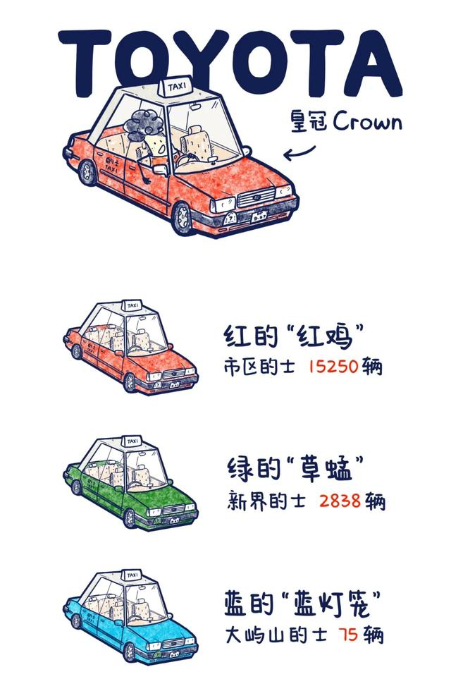 香港的士会按照其指定行驶范围,区分不同颜色。