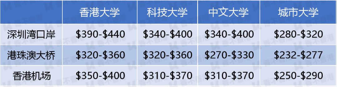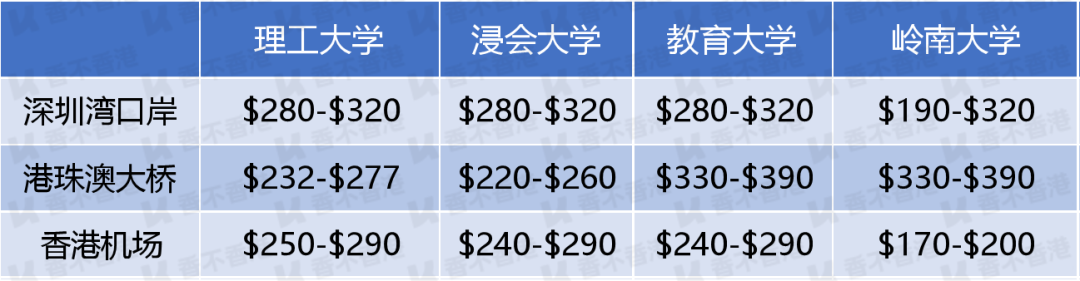 以上是从香港三个口岸出发,到8校校门口,且不计行李费等费用的价格范围。只要在区间范围内,都是合理价格,因为行驶过程中,可能有塞车情况。
